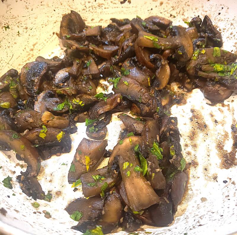 - Saute the mushrooms, garlic, parsley, salt and pepper until softened.