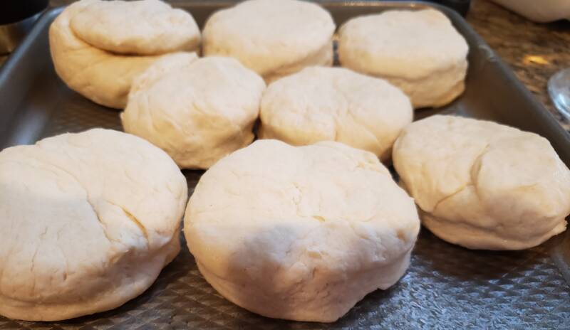Roll the dough to about a 1″ thickness. Cut into round shapes. The amount of biscuits you end up with depends on the size object you use to cut the biscuits. The biscuits will not spread very much, but they will puff upwards. I use a smaller size biscuit cutter to cut my biscuits,
