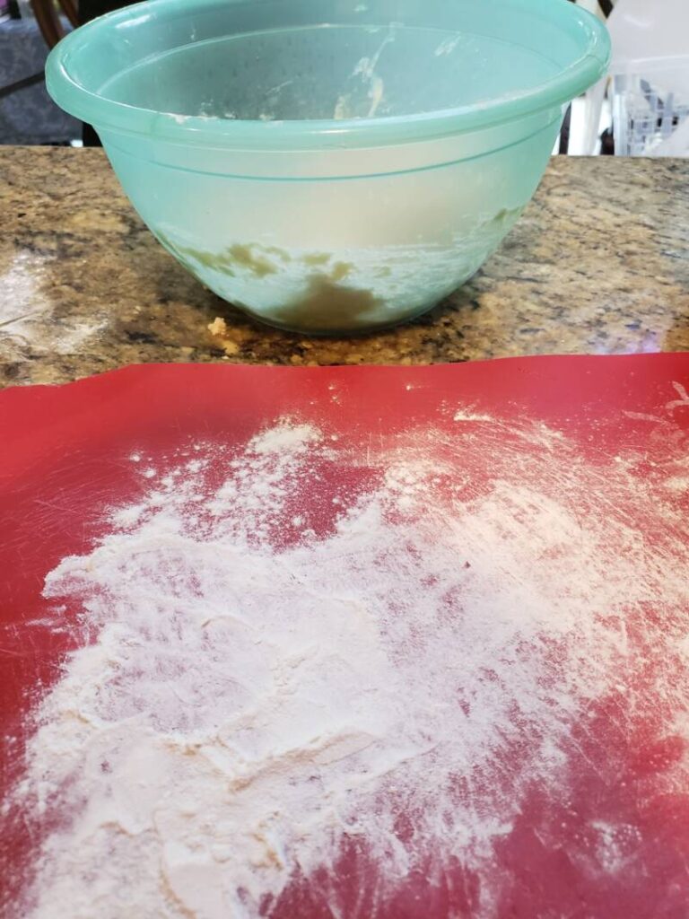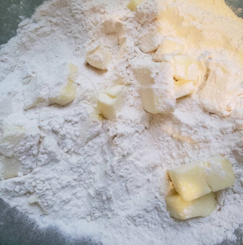 In a bowl, add the self-rising flour. Add the cubed butter to the flour. The butter must be very cold. Smoosh the butter into the flour by hand. Mixing the butter into the flour by hand creates a fluffier biscuit. I’ve tried making the biscuit dough in a food processor, but it seems dense to me. It could be my imagination, but my gut tells me it is not. I’ve also used a pastry cutter, but I end up using my hands anyway, so I might as well use my hands for the whole job. Once all the butter cubes are incorporated into the flour, you should not be able to feel any significant globs of butter.