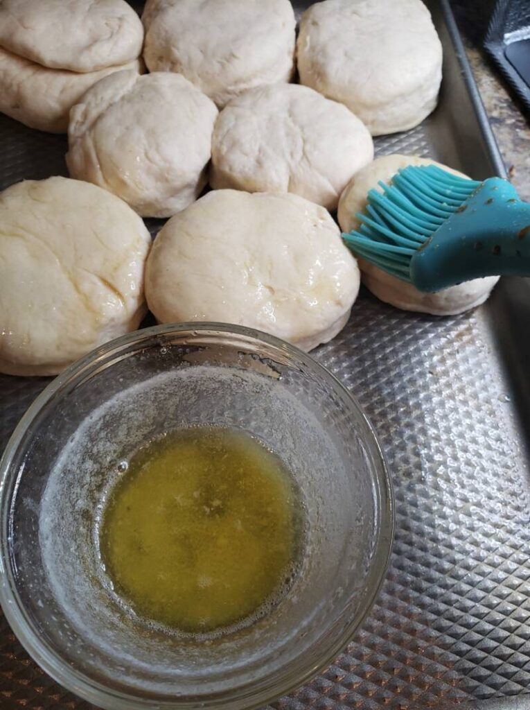 Place the biscuits in a greased pan and brush the tops with melted butter.
