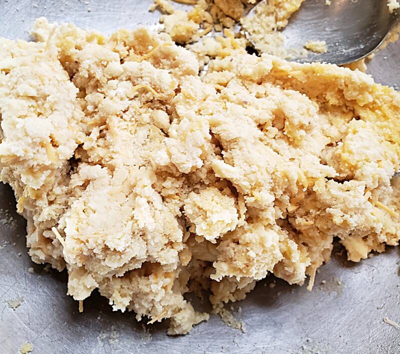In a bowl, add the self-rising flour. Add the cubed butter to the flour. The butter must be very cold. Smoosh the butter into the flour by hand. Mixing the butter into the flour by hand creates a fluffier biscuit. I’ve tried making the biscuit dough in a food processor, but it seems dense to me. It could be my imagination, but my gut tells me it is not. I’ve also used a pastry cutter, but I end up using my hands anyway, so I might as well use my hands for the whole job. Once all the butter cubes are incorporated into the flour, you should not be able to feel any significant globs of butter.