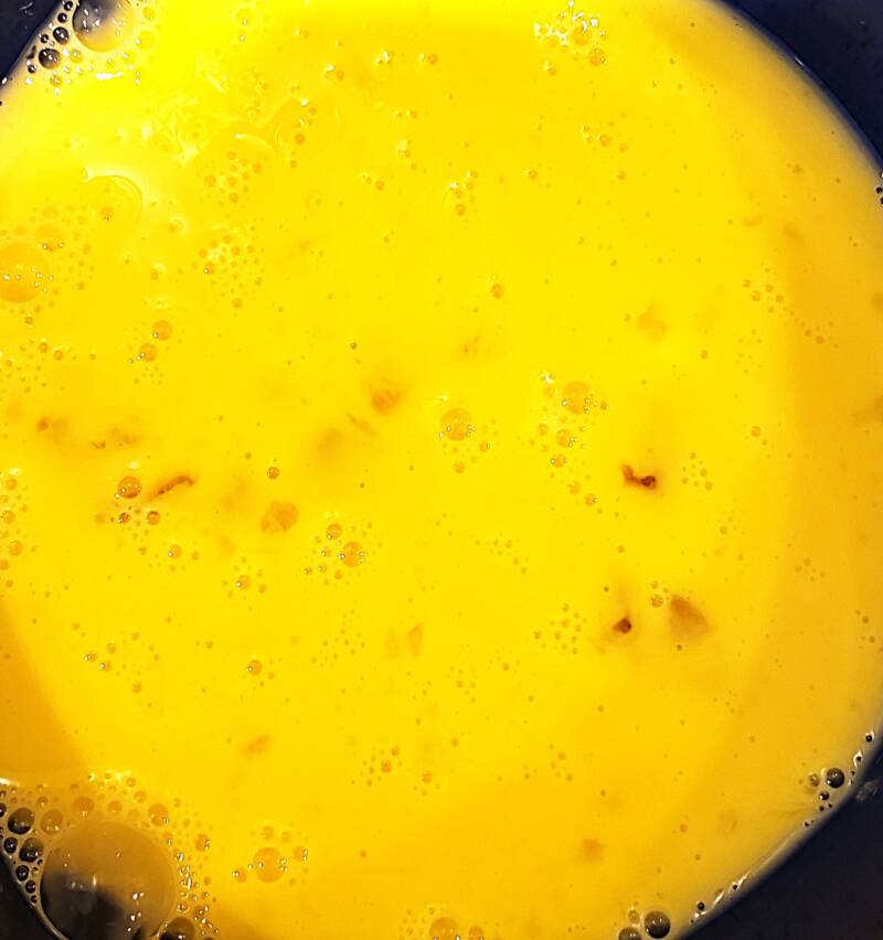 Return the soup to a rolling boil. Pour in the beaten egg in a constant stream while stirring in a circular motion so that the egg creates thin strands throughout the soup.
