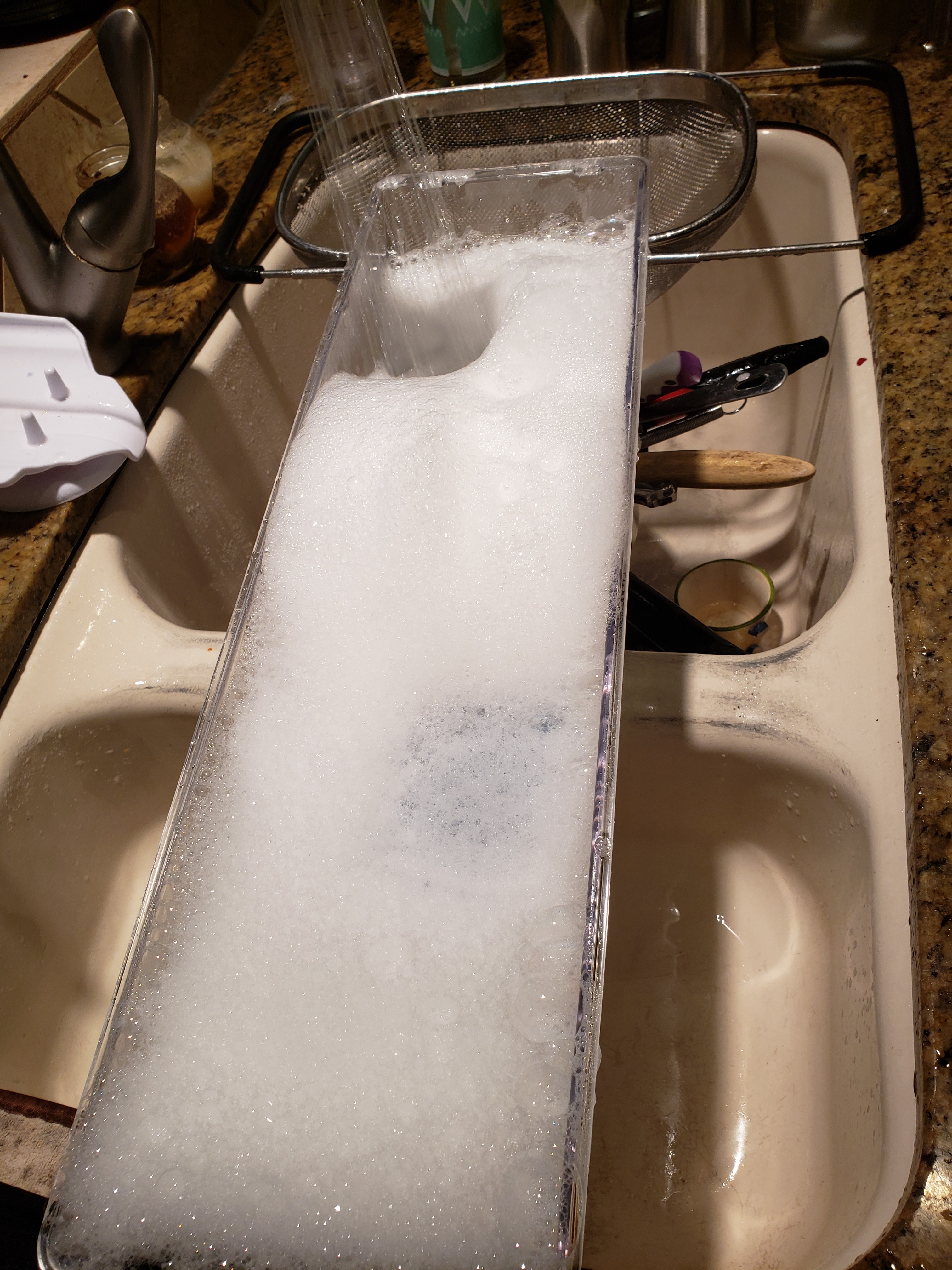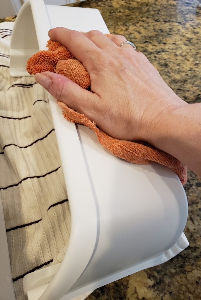 3. Wash and dry the shelf with hot soapy water in the kitchen sink, being very careful not to break the glass.
