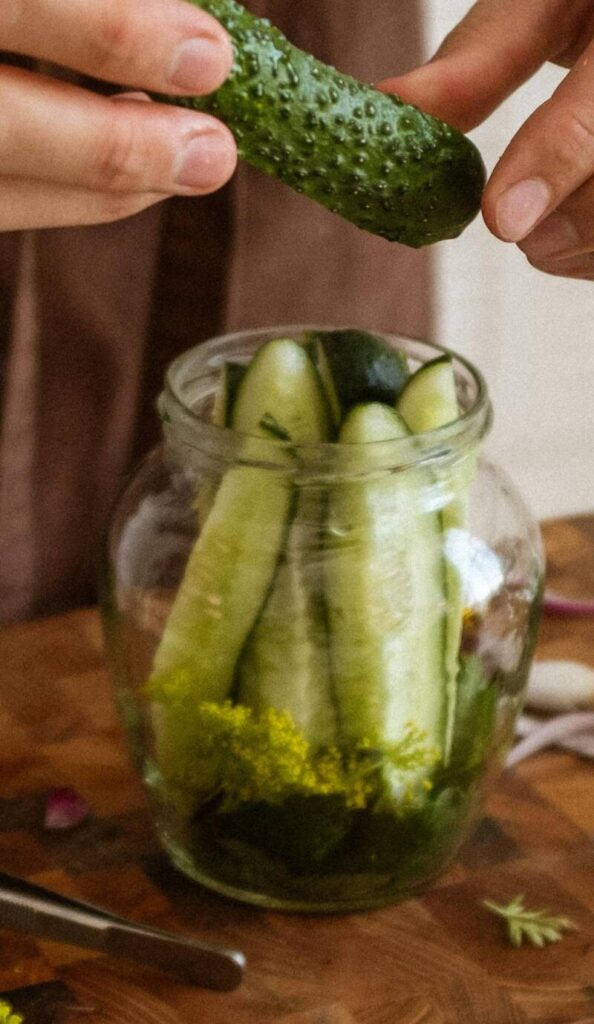 Pour the brine over the cucumbers, leaving 1/4″ headspace.