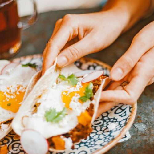 - Place the fried egg on top of the green chiles and spoon the salsa and toppings on top.