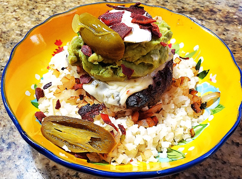 To serve, place cauliflower rice or jasmine rice in a serving-size bowl. Add caramelized onion and one or two chicken thighs. Top with guacamole, sour cream, crumbled bacon, and pickled jalapeno. Serve.