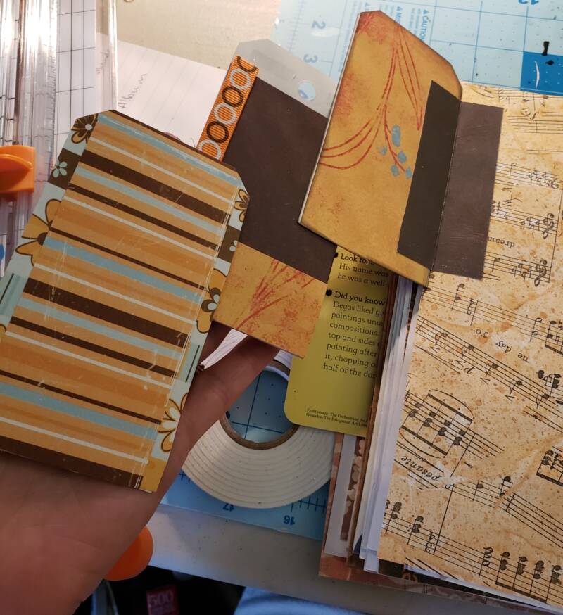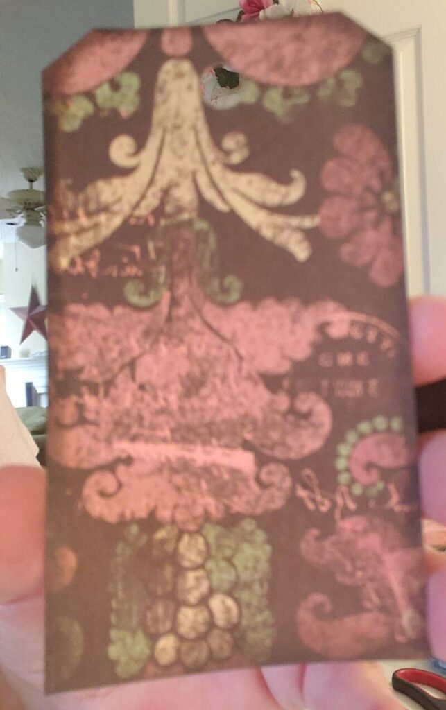A junk journal is similar to a scrapbook in that it can contain similar elements; however, in a junk journal, you can transform paper scraps, bags, envelopes, book pages, old buttons and many other items that might be thrown away into beautiful embellishments and pages. Today, I used three tags in my stash that were fine on their own, but they have been languishing, so I decided to make them more interesting by creating a flip-out door for the junk journal I am working on.