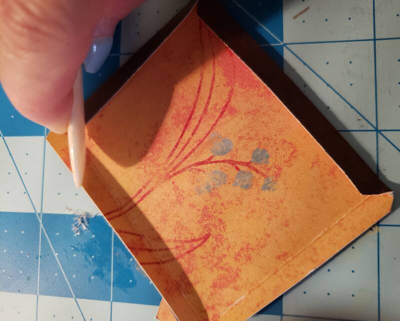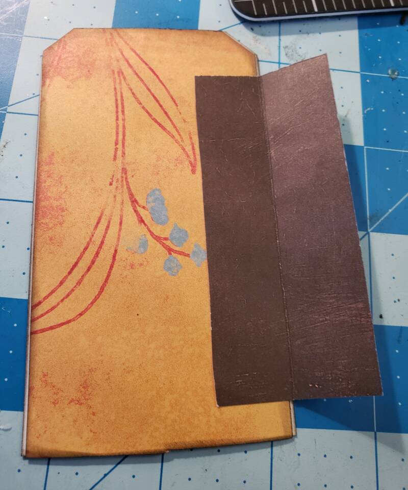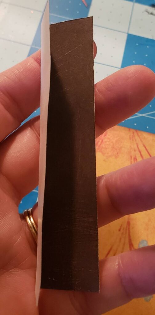 Now that all the paper is cut, score the 2 ” x 4″ piece down the middle and fold. Burnish the edge down with a bone folder or popsicle stick so that the crease is flat. Set aside