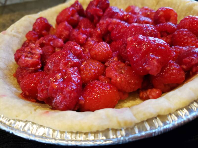 Bake off the pie shell in the oven for about 10 minutes at 325 degrees. Place the remaining raspberries in the pie shell and pour the raspberry glaze mixture over the raspberries in the pie shell.