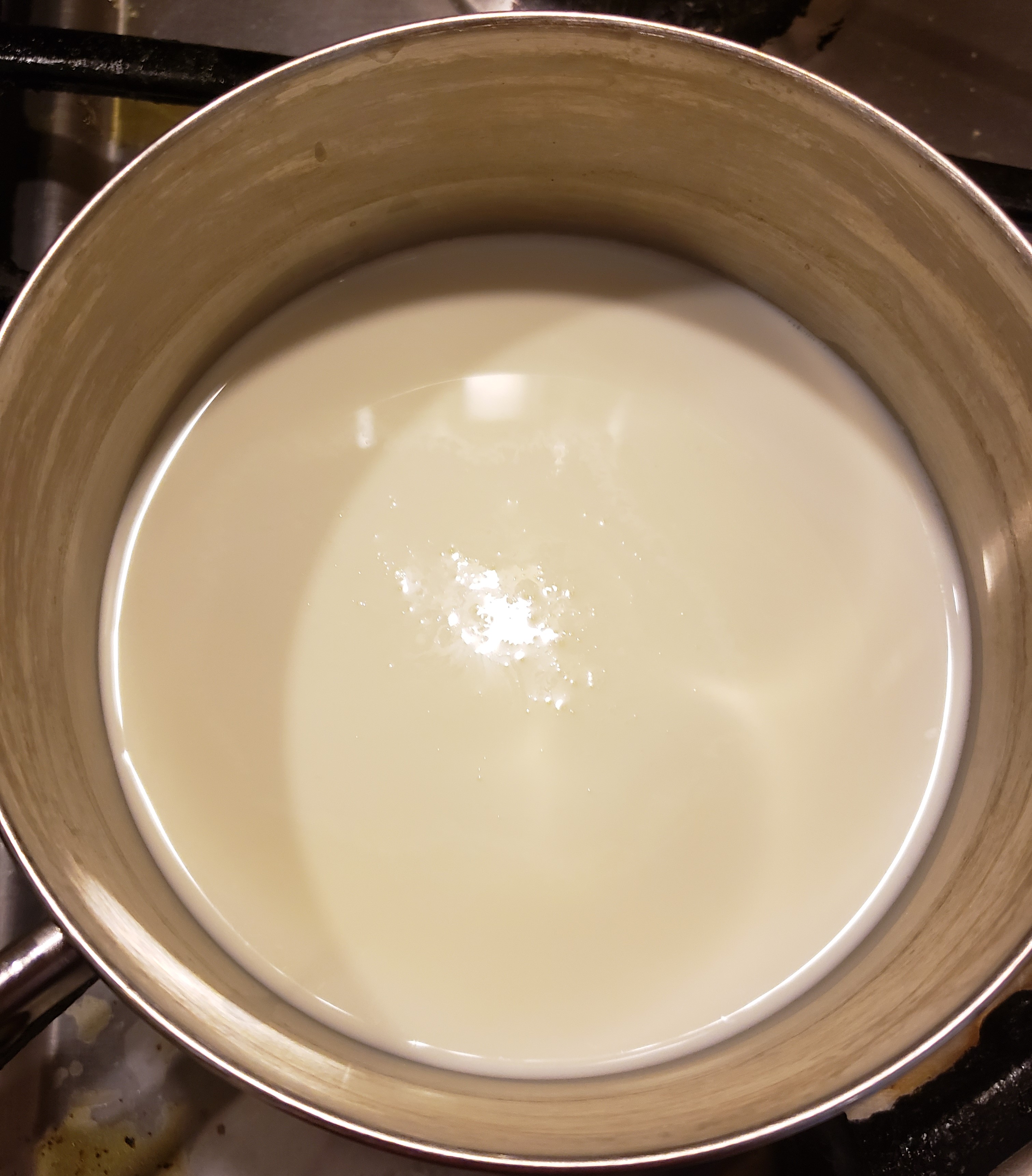 In a saucepan, heat the cream, milk, vanilla and cinnamon.