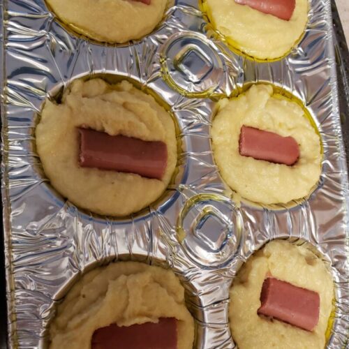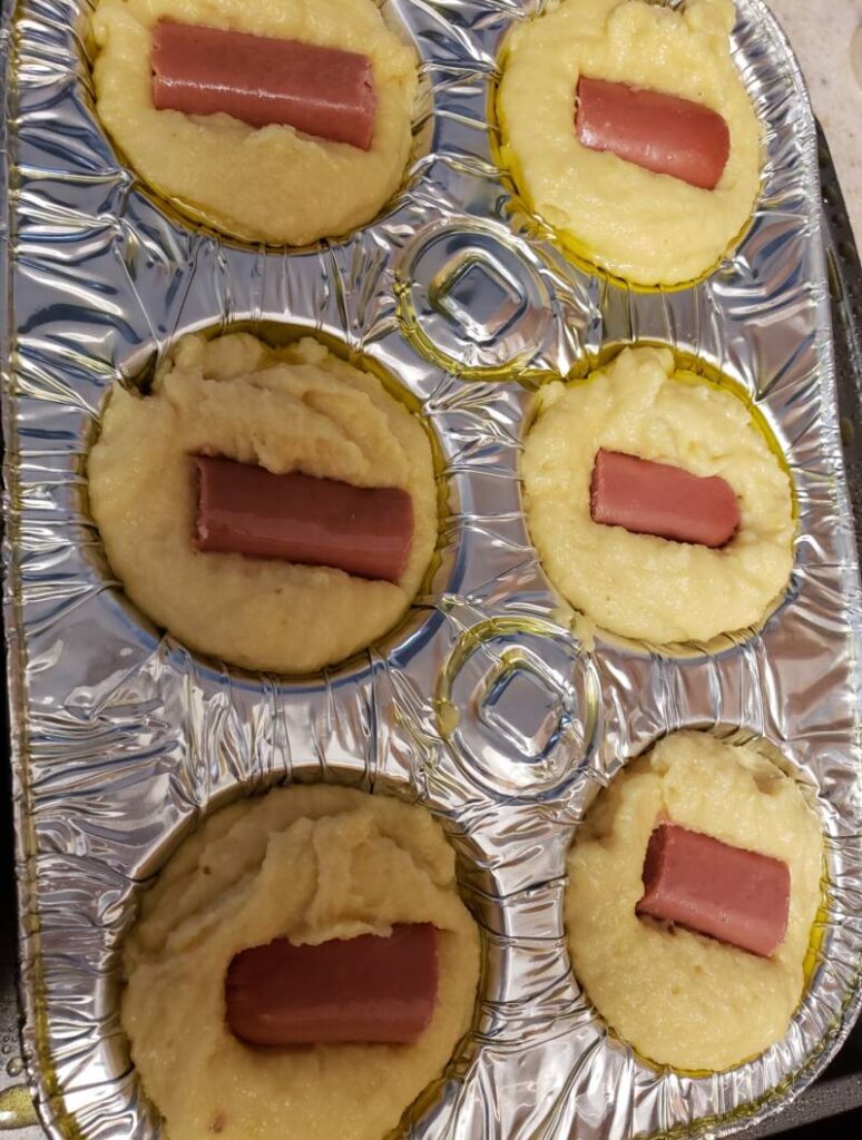 - Place one hot dog segment on top of the cornbread mix in each of the muffin tins.