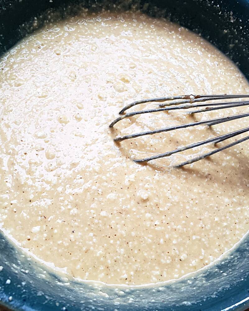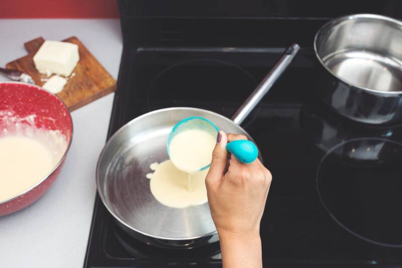 - Ladle some batter into the hot skillet and cook until bubbles form on the top of the pancake.