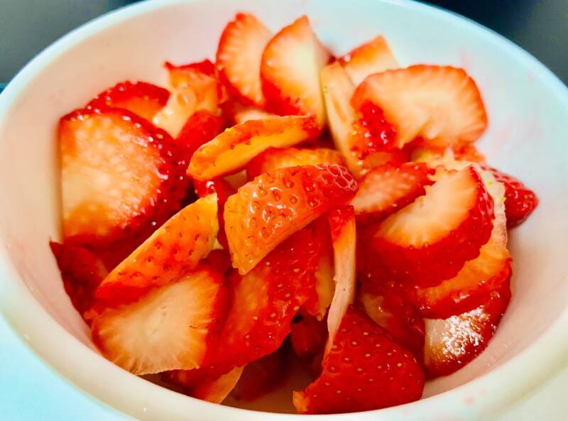 - In a bowl, combine the sliced strawberries and 1 tsp. monk fruit sweetener. Set aside.