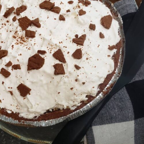 Decorate the top with the peanuts or a drizzle of chocolate syrup. If you are serving to guests, you can use a pretty pie plate for a nicer presentation. We often have this delicious pie as an anytime treat, so I used the convenience of having the aluminum pie plate to store it in.