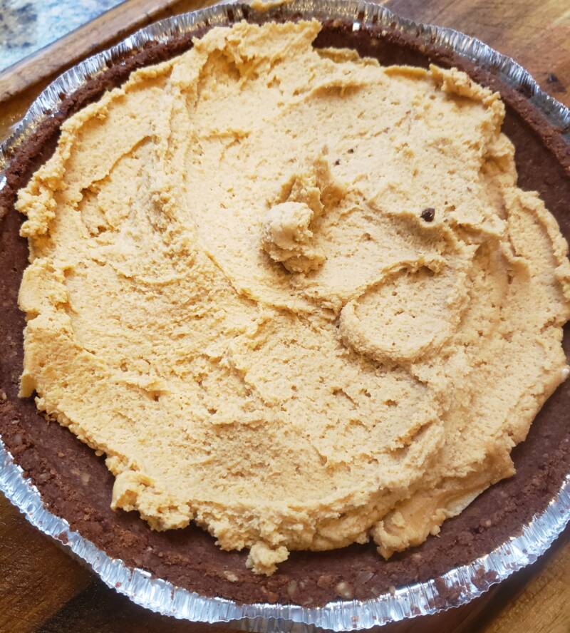 Spoon the peanut butter mixture into the pie crust. Smooth the mixture evenly.