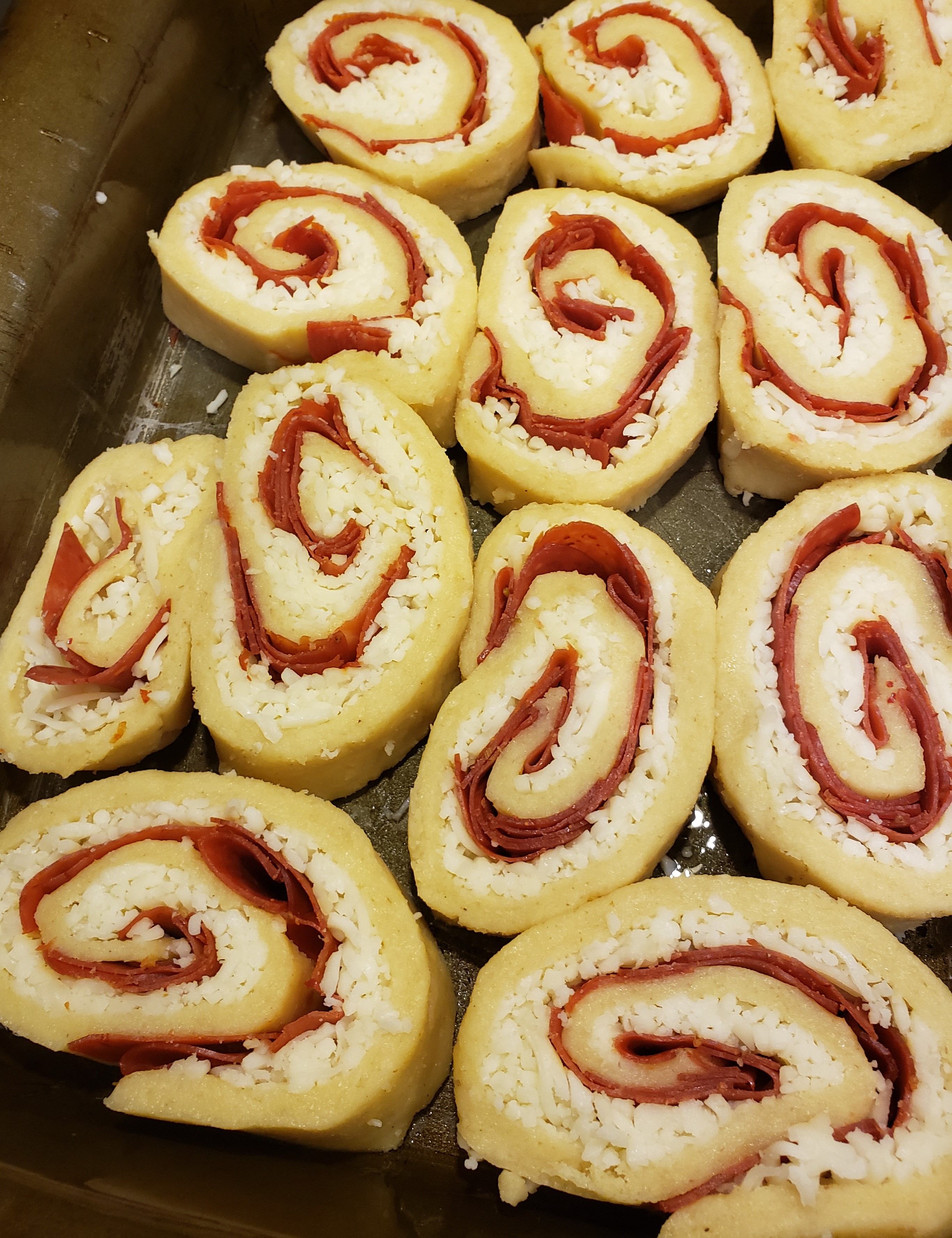 Cover the dough sheet with mozzarella cheese. Top the cheese with pepperoni. From the longest side, roll up into a log like you would cinnamon rolls. Seal the ends by pressing the dough together. Cut the log into disks about 1 inch in width. Place the rolls in a greased pan on their flat side.