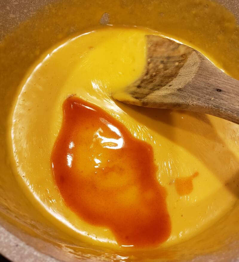 - Add all the spices, Worcestershire, hot sauce and Dijon mustard. Stir until combined.