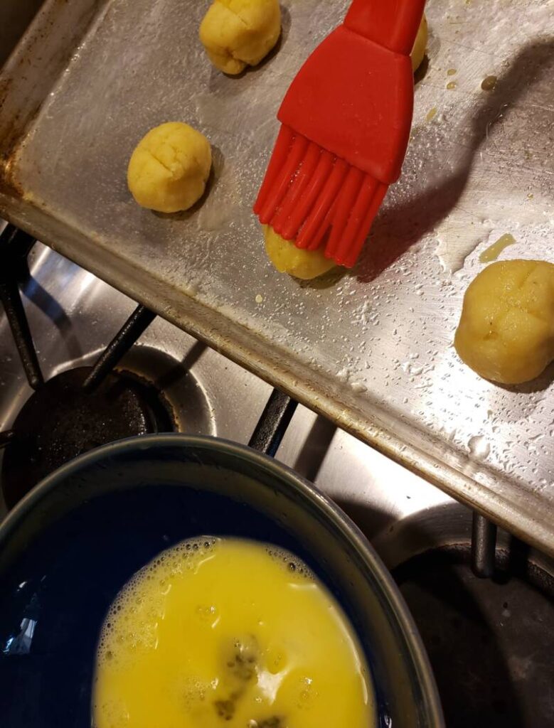 - Combine the egg and some water in a small bowl to form an egg wash. Brush the pretzel balls with the egg wash using a basting brush.