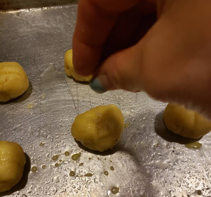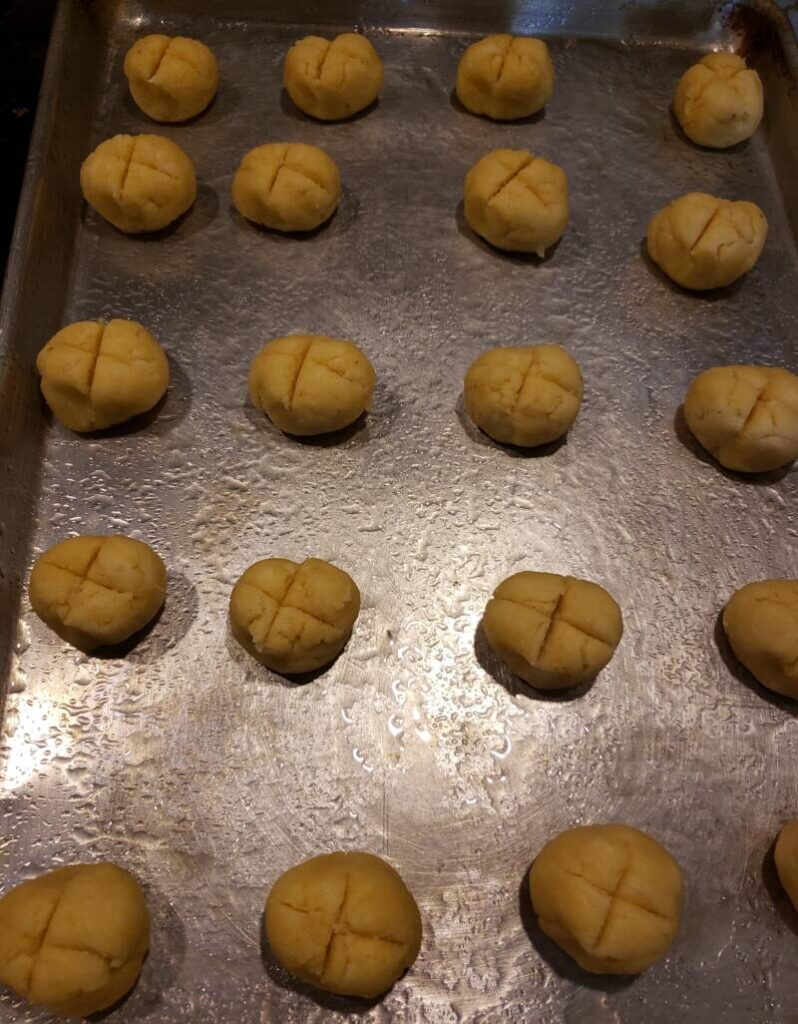 - Divide dough into 16 portions. Roll into balls. and place on the baking sheet. Using a knife, cut an X on the top of the dough ball.