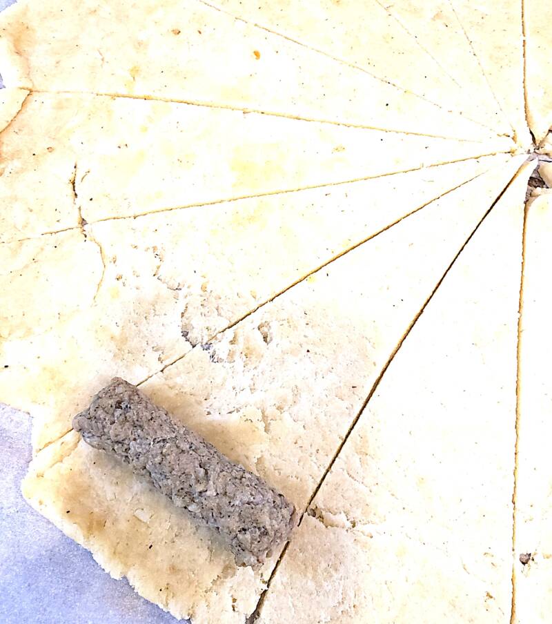Crescent roll dough or fathead dough (I had to make 3 batches of fathead dough to use up the big bag of Costco sausages): 3/4 block cream cheese, 1-1/2 cups shredded mozzarella, 1-1/2 cups almond flour, 1 Tbsp. Psyllium husk powder, 1 tsp. baking powder, 1 tsp. xanthum gum, 1 egg