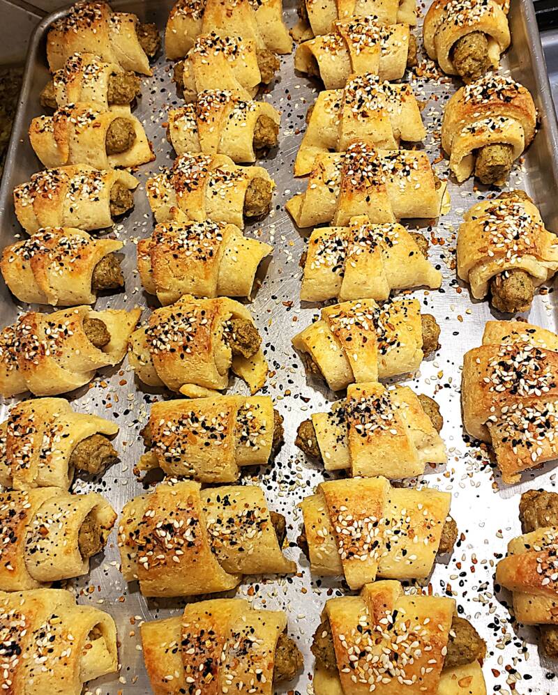 Place the rolled-up sausages on a cookie sheet sprayed with cooking spray. Sprinkle generously with Everything But the Bagel seasoning, pressing the seasoning into the dough. Bake in a 350-degree oven for about 30 minutes or until browned on the top.