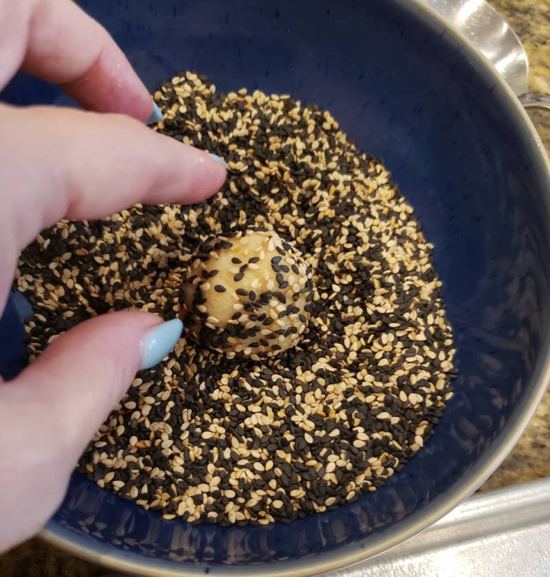 - Roll the cookie balls in the sesame seeds and return to the baking sheet.