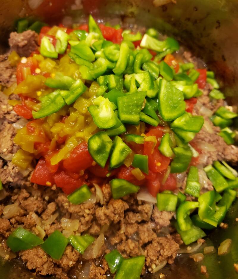 Add the ground beef mixture back to the pan. Add the Rotel, green chiles and green bell pepper. Cook until the peppers are tender.