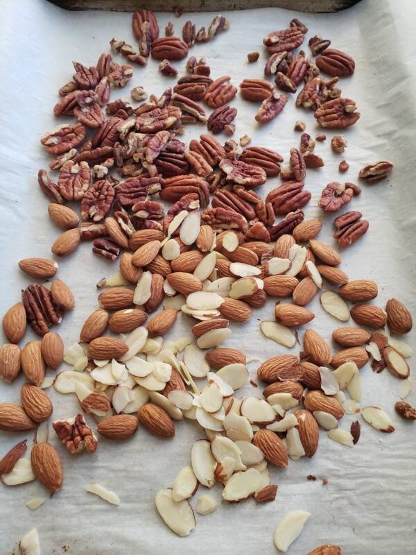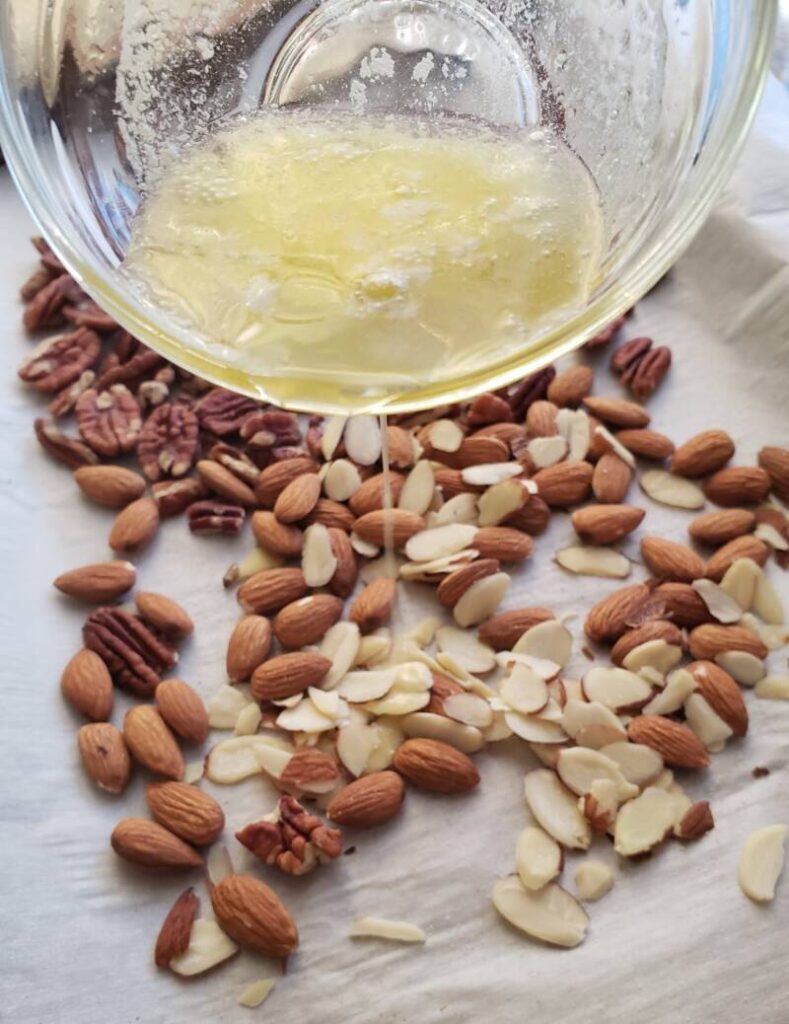 Place the nuts on a sheet pan lined with parchment paper. Pour the melted butter on the nuts and toss to coat. Place the nuts in a 350-degree oven and roast for about 5-10 minutes, stirring once every minute. Make sure to keep an eye on them because they can burn in a blink of an eye. When the nuts are done, remove from the oven and set aside.
