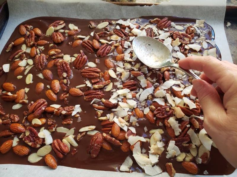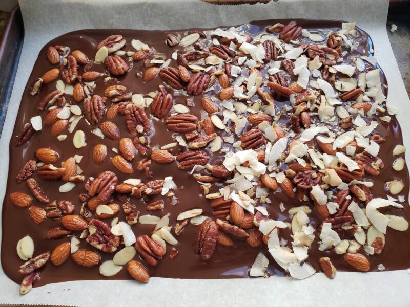 While the chocolate is still wet, sprinkle the top with nuts. I used pecans and almonds, but use whatever nuts you like. Then sprinkle with unsweetened coconut flakes. I only sprinkled half the nut bark with coconut to accommodate the preferences in my home. Gently press the nuts and coconut flakes into the chocolate. Place in the refrigerator for 30 minutes.