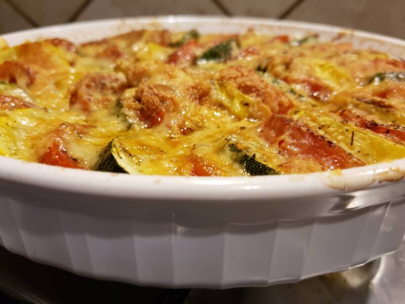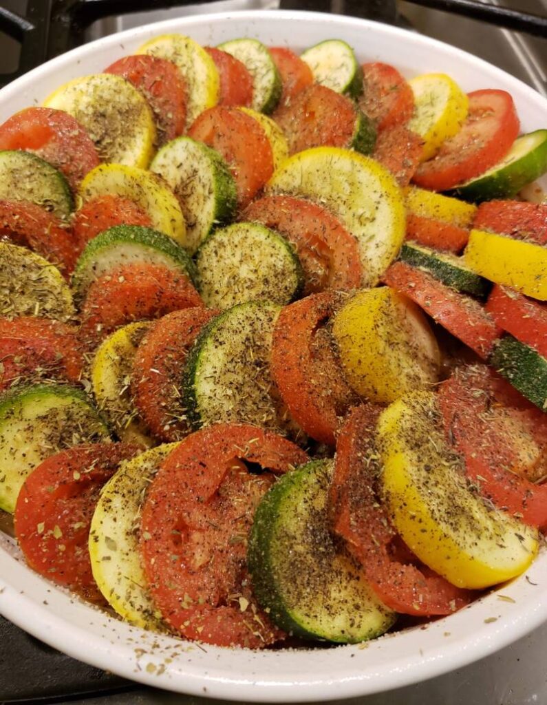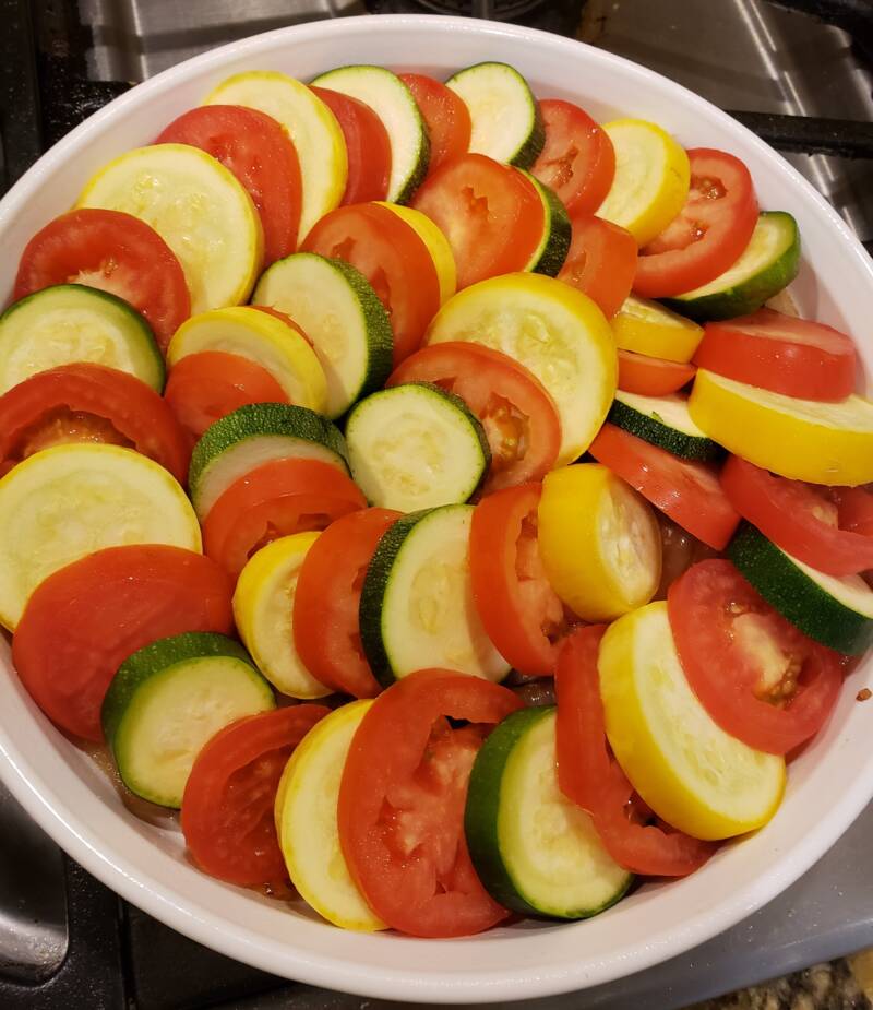 A vegetable tian usually has potato slices. I can certainly make this tian with potato slices by using starch-resistant potatoes made a day ahead, but sometimes I become more strict with my diet than at other times, so it is perfectly fine to omit the potatoes for a lovely and tasty vegetable tian. The layers of squash, tomatoes, and zucchini are a colorful addition to any table.