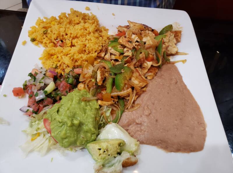 My husband ordered the chicken fajita dinner. The food came out piping hot, which is really important to him, but it did not come out on a sizzling plate as they do at other Mexican restaurants. The fajitas came with rice and refried beans along with some pico de gallo and guacamole. On the side, came a steamer of homemade flour tortillas. The chicken fajita filling was loaded with fresh peppers and had a good taste to them.
