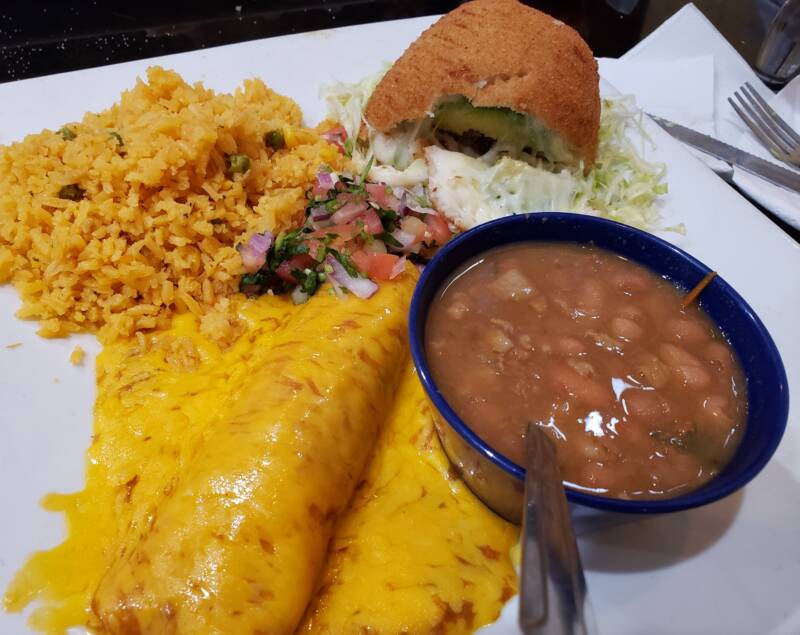 Their specialty is the Fajitas Poblanos, which I may have the next time I visit. They sound wonderful. Instead, I ordered the Fried Avocado plate. This was a hard decision for me because I also like the sound of the Fajitas Poblano The Fried Avocado plate came with an enchilada with your choice of filling, charro beans and Mexican rice. I chose a chicken fajita filling for my enchiladas and I was pleased with my selection. The fried avocado was filled with chicken fajita meat and cheese. It came out perfectly crispy on the outside and soft on the inside. Delicious! The rice and beans were flavorful and the enchilada was smothered in gooey cheese.