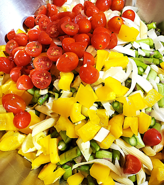 - Mix well until all the pasta and vegetables are coated.