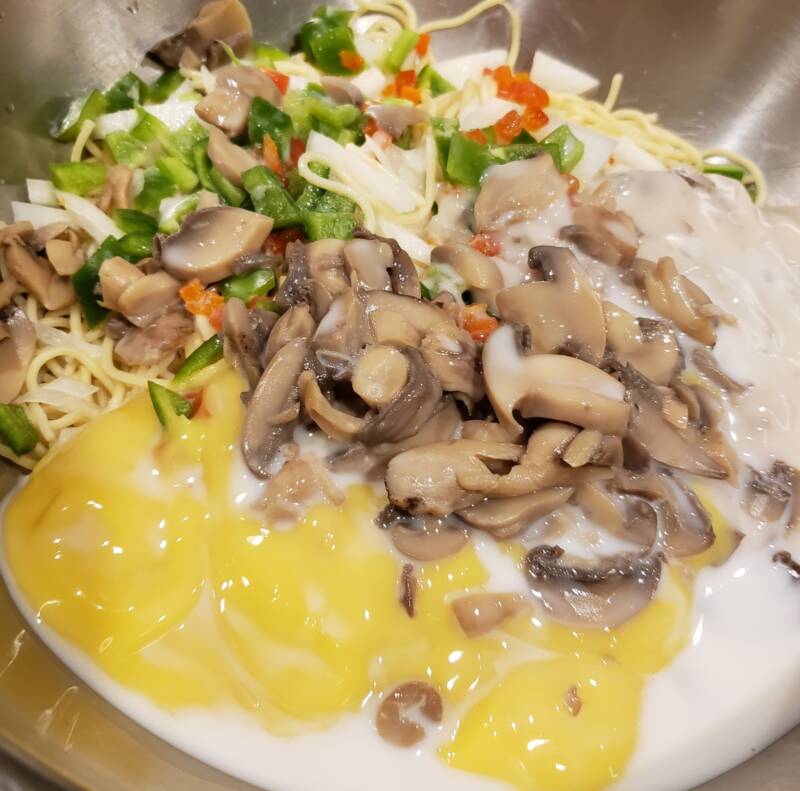 - In a separate bowl, combine the cream of mushroom soup, cream of chicken soup, milk, pimentos, seasoned salt, pepper, and cayenne pepper. Whisk together until combined. Pour the soup mixture over the spaghetti and stir to combine. Add the mushrooms and stir to combine.