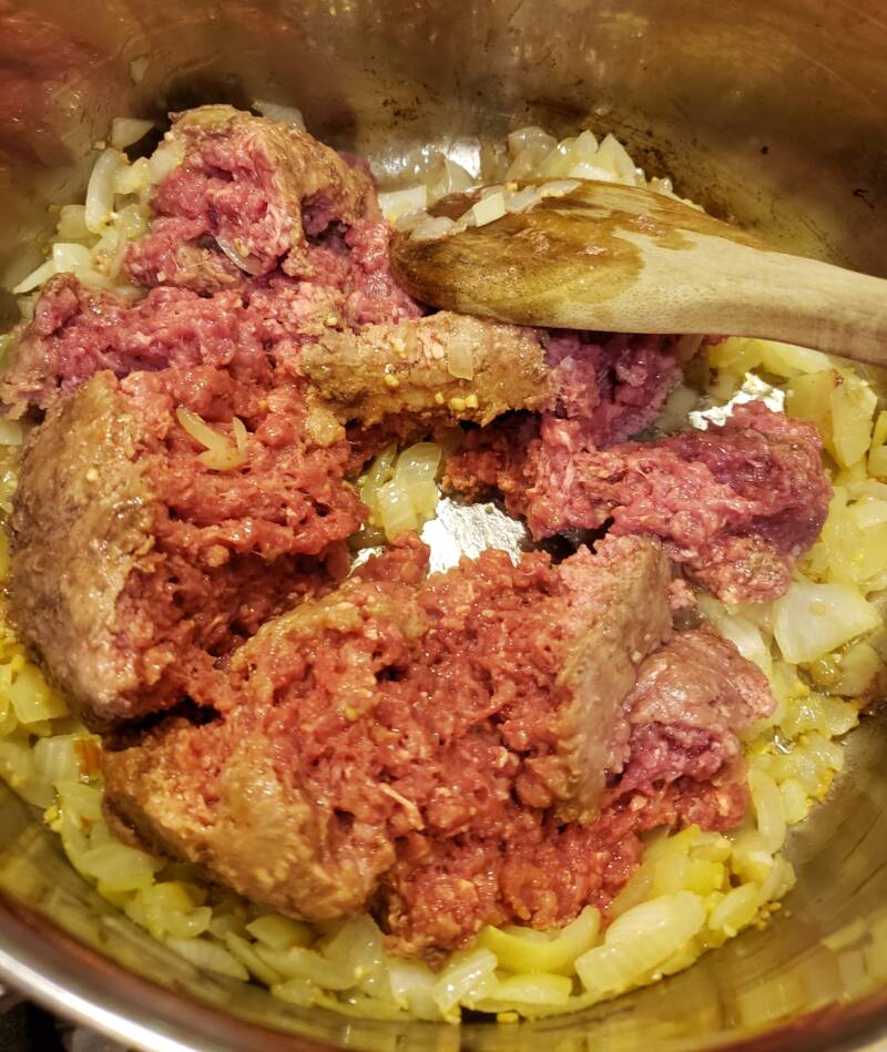 In a large frying pan, combine the ground beef, half of the chopped onions, peppers and garlic. Cook until meat is no longer pink. Drain.