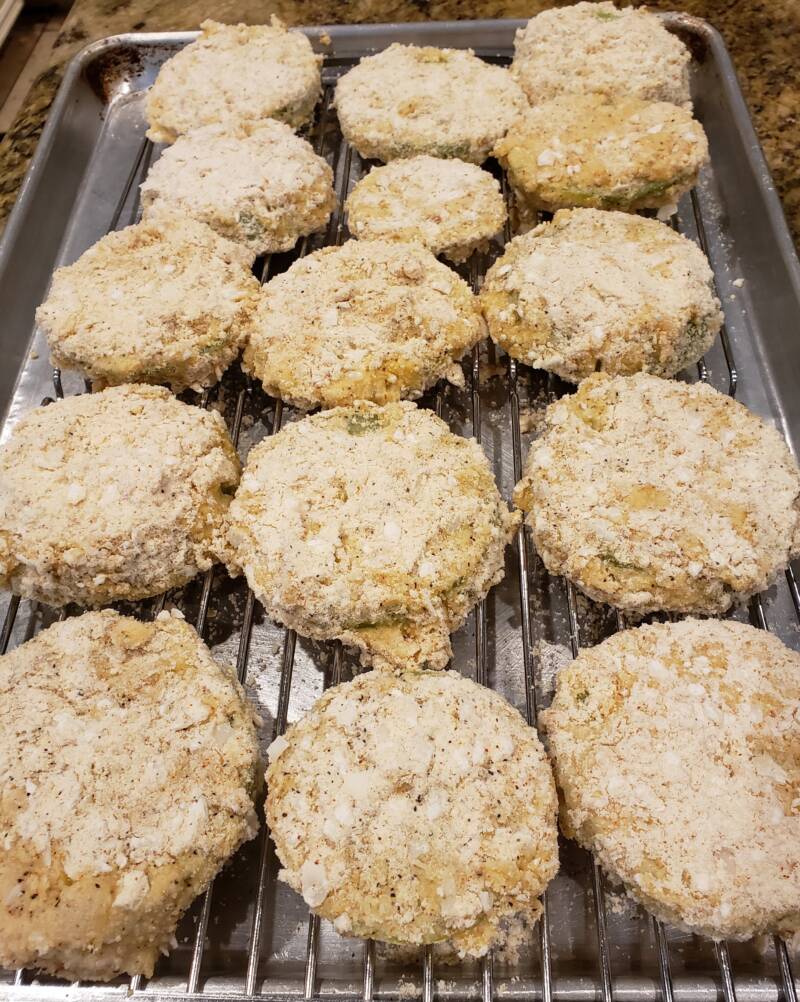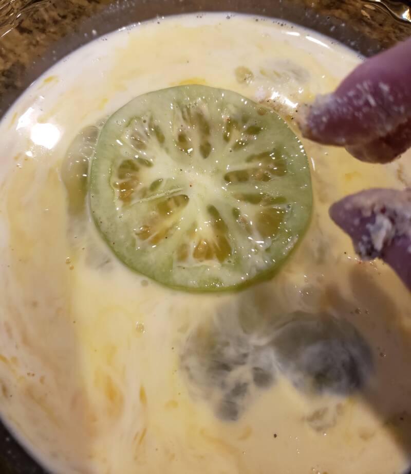 Dredge the tomatoes first in the CarbQuik, then the egg, and then the Parmesan mixture. I like to do all the breading at once before I start frying. I line them up on a wire rack to make the process easier.