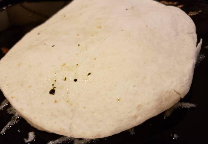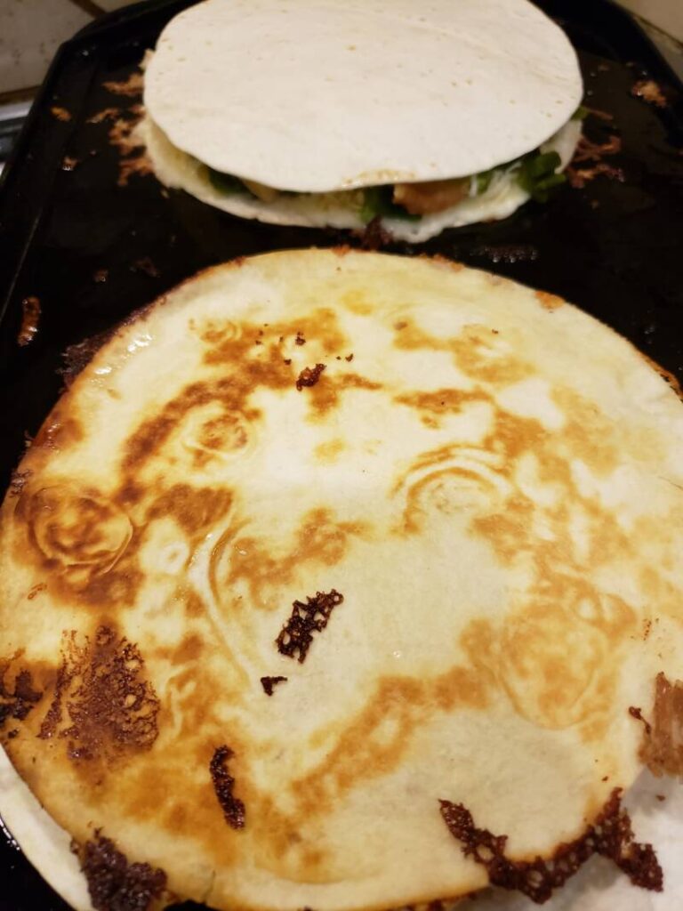 Place the quesadilla on the hot griddle. When the bottom tortilla is browned and the cheese has started to melt, carefully flip the tortilla to the other side. This requires a little bit of dexterity and skill. Use a very large, sturdy spatula to help flip the quesadilla. You want to make sure the bottom tortilla is stiff enough to withstand the flip; otherwise, the tortilla will collapse and everything will slide out. It is also helpful that the cheese on the bottom and top layers are somewhat melted for it is the glue that holds it together. Press down gently on top of the top of the quesadilla before flipping to give it some stick-to-itiveness. Breathe a sigh of relief when you have successfully flipped the quesadilla!