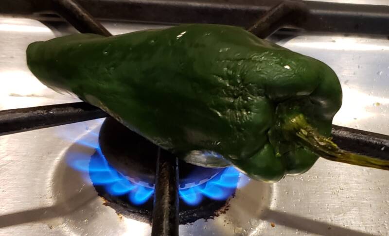 Place the peppers in a resealable bag and allow them to steam from their own heat for a few minutes. Remove the pepper from the bag and peel off the skin. The skin should slide off easily when steamed. Cut off the stem and chop the pepper.