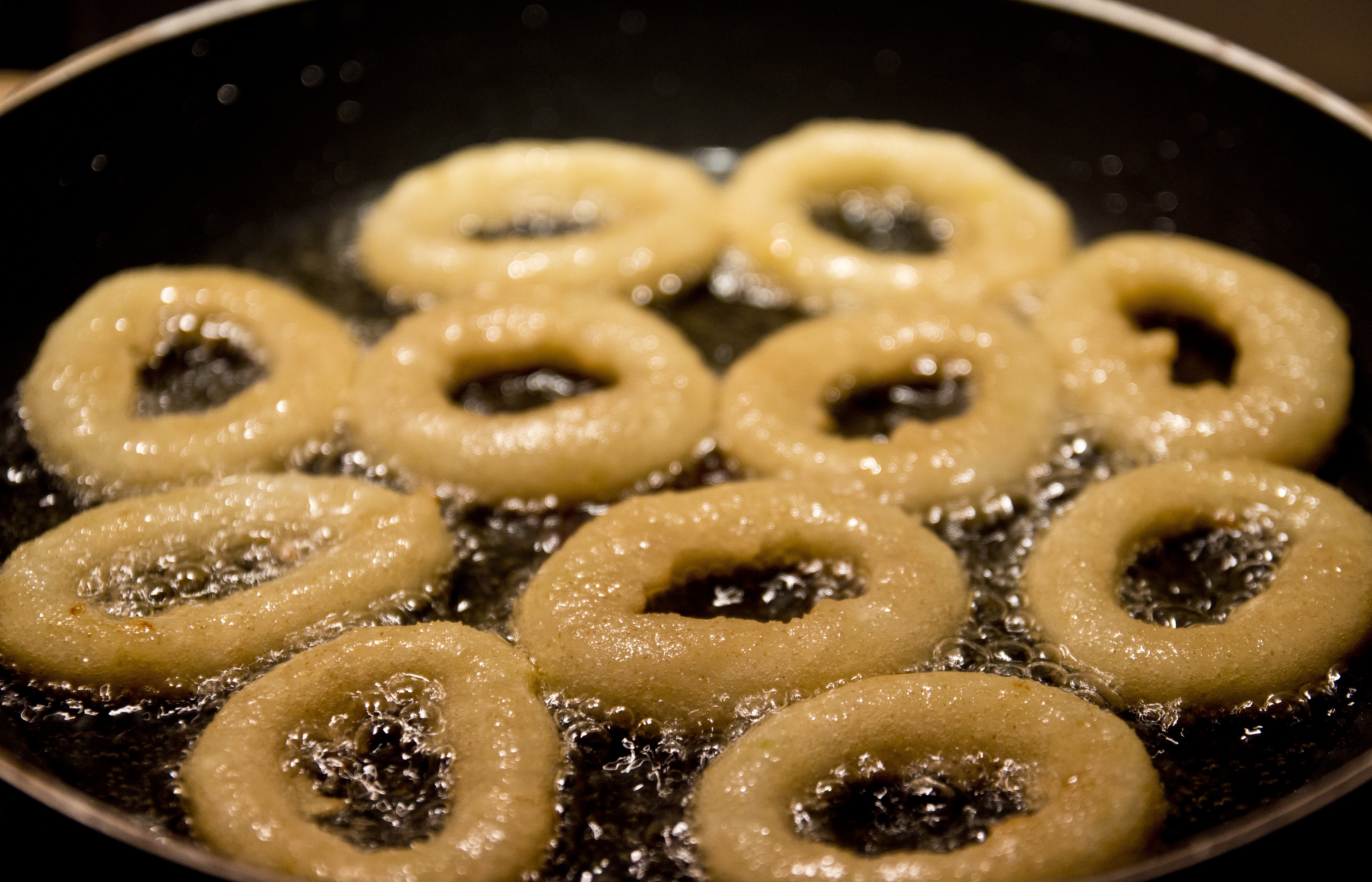 Place the coated onion rings in the hot oil in a single layer. Do not disturb them until the bottoms are firm and golden. Flip them using a wooden skewer. If you use anything other than a skewer, the batter will come off. Fry the other side until golden.