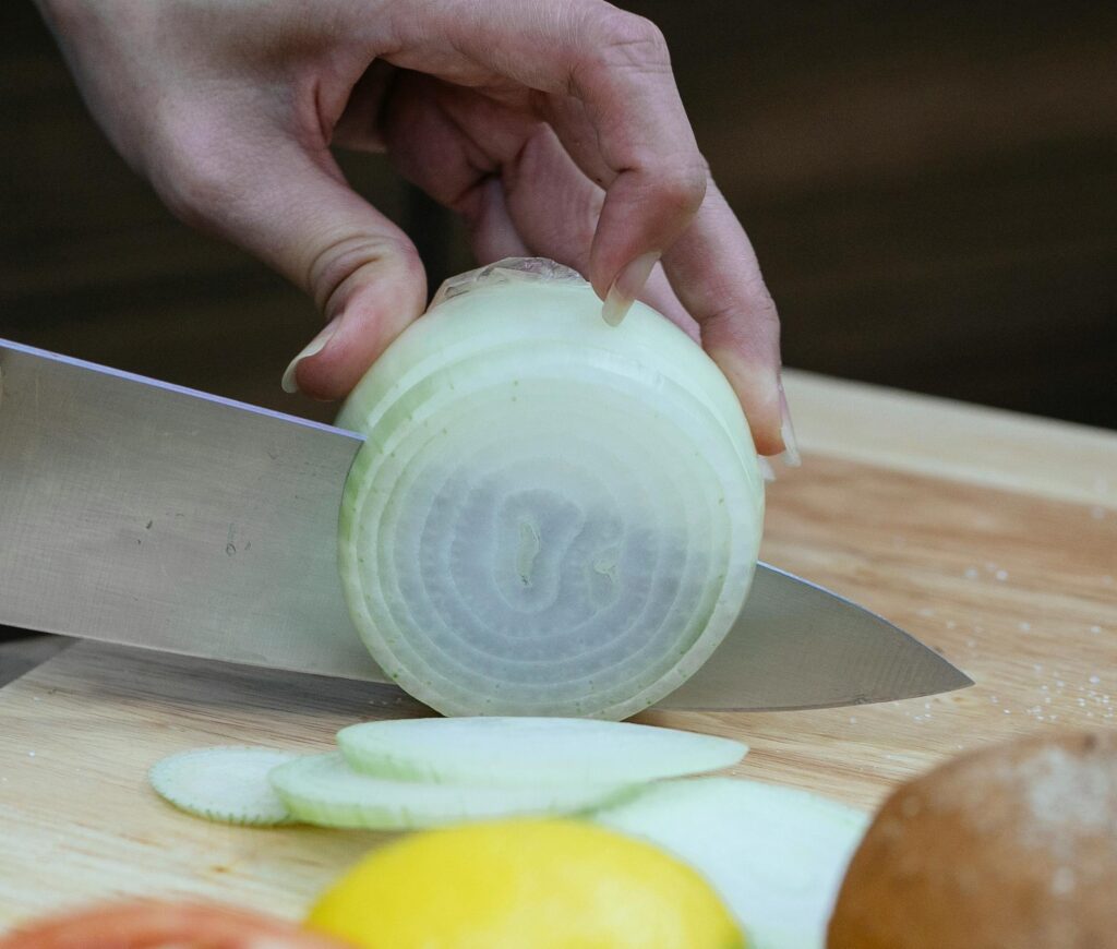 - Slice the onion into ½-inch slices and separate the rings.