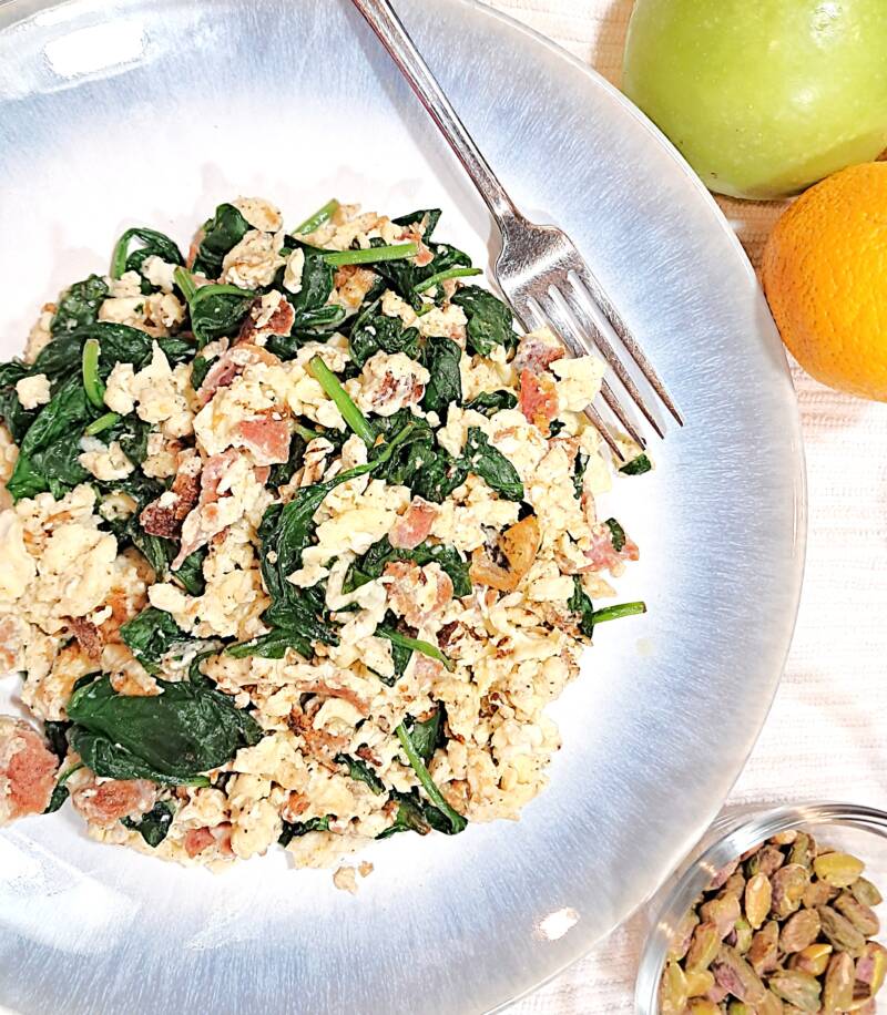 Breakfasts – Spinach Bacon Scramble, Bagels with Cream Cheese, Bacon