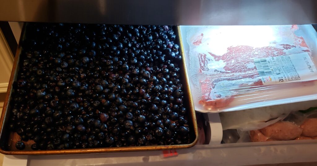 Freezing blueberries – Kroger also had 18 oz. cartons of blueberries on sale for $1.99. I spread the blueberries on a baking sheet and flash-freeze them. After they are frozen, I place them into a Ziploc bag to store in the freezer to use in future recipes.