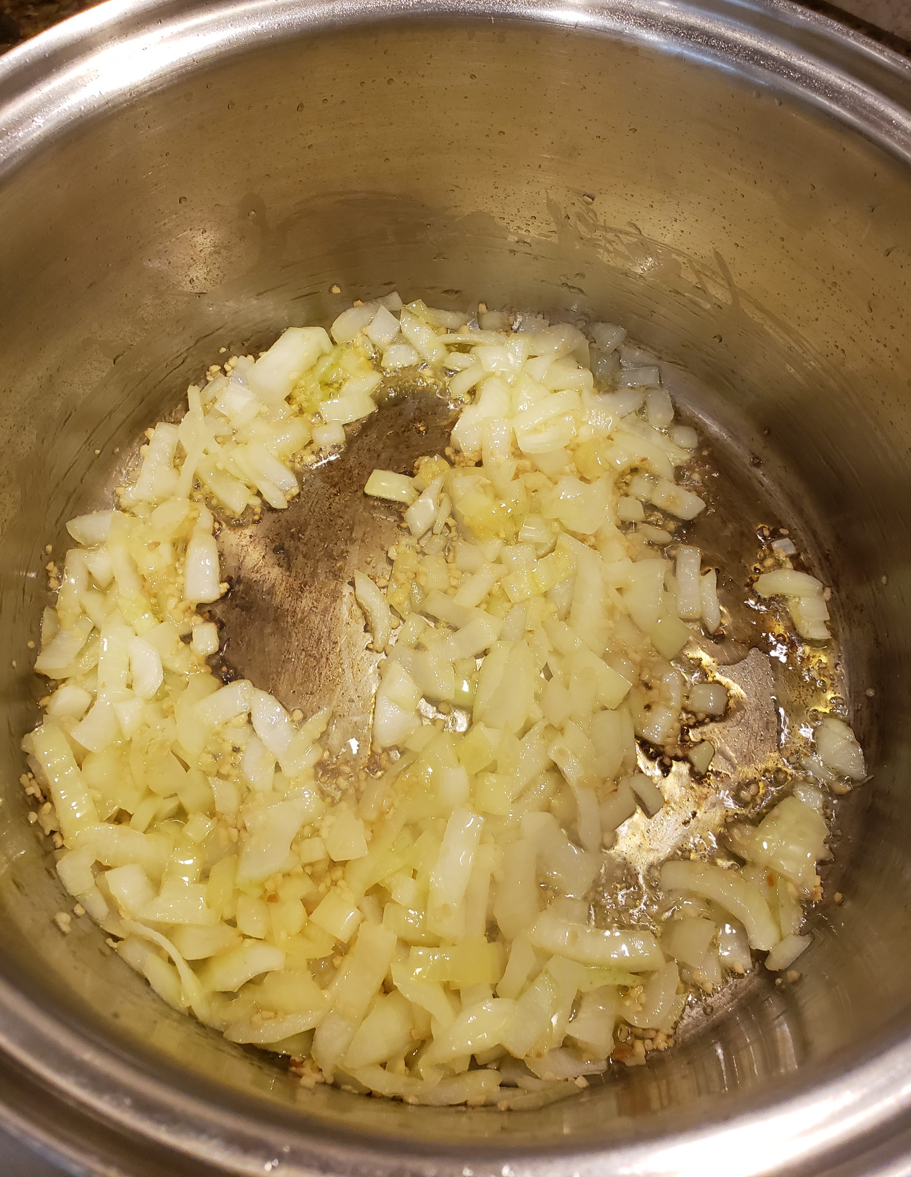 Add the garlic and onion to the hot pan. You can use yellow or red onion, depending on what you have. On this day, I used a yellow onion. Lower the heat and cook until the onion softens and caramelizes, about 5-7 minutes.