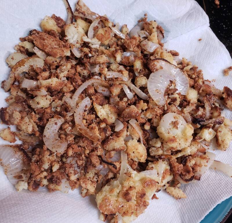 - Sprinkle the Carbquik or almond flour over the top of the onions. Allow frying until the flour coating is crispy. Drain on a paper towel.
