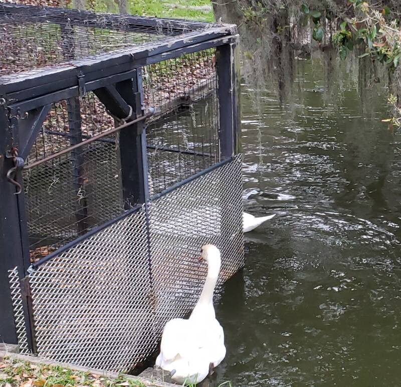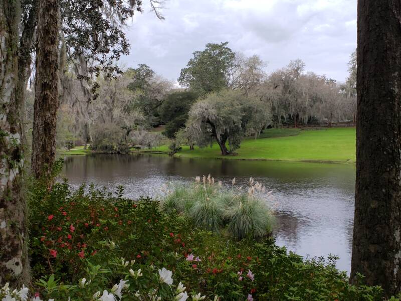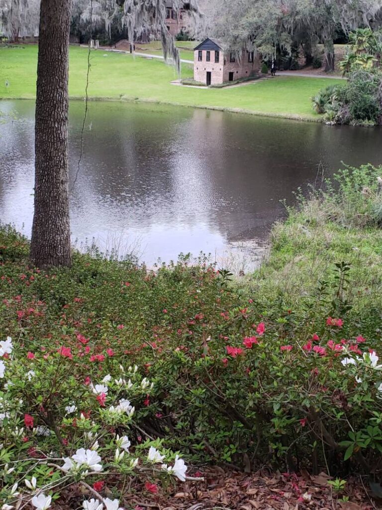 Beautiful crepe myrtles, camellias and azaleas bloom in the Spring months to add color to the vignettes. A reflecting pool with swans flows into the Ashley River. On this day, it was about to rain and the swans wanted back in to their swan house.