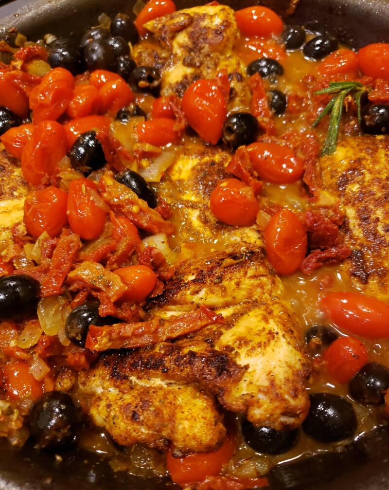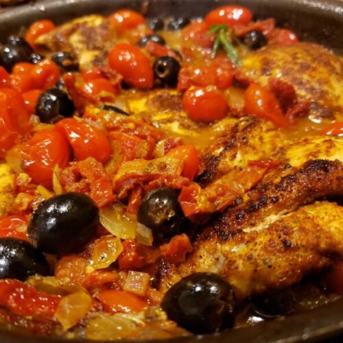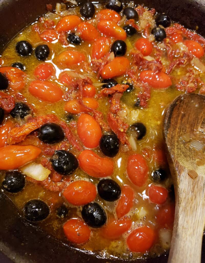 Add tomatoes and cook until the grape tomatoes start to burst. Add the olives. Add the wine and chicken stock. Deglaze the pan while stirring. Add the oregano, saffron, lemon and rosemary. Stir and reduce the liquid by half.