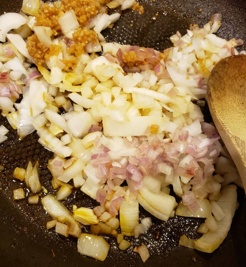 - In the same skillet, saute the onion, garlic and shallot in olive oil.