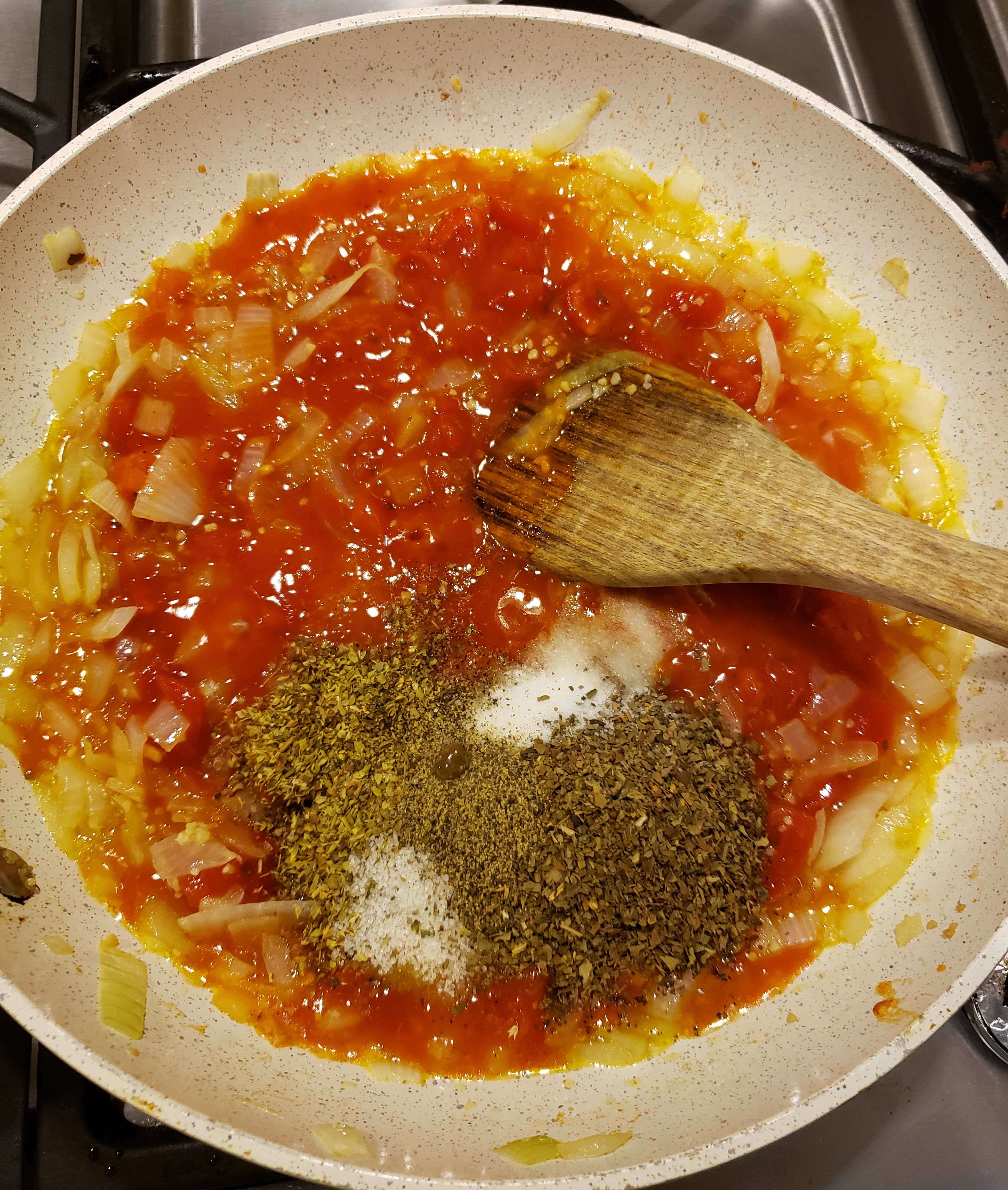 Add the can of diced tomatoes and dried thyme, basil, salt, pepper and sweetener. Stir until combined and hot.