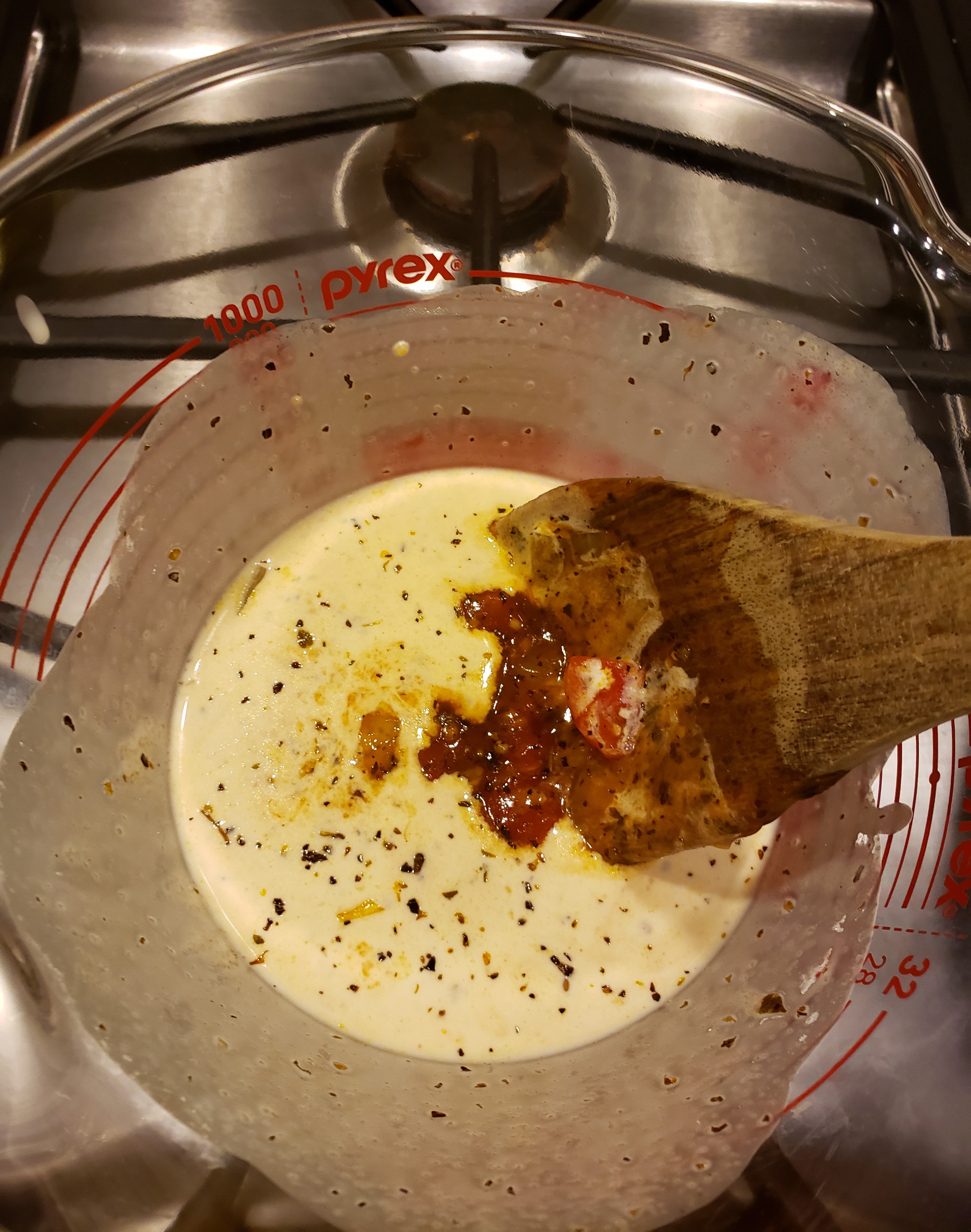 In a large measuring cup or medium-sized bowl, pour in the heavy cream. Add a couple of spoonfuls of the hot tomato mixture to the cream to temper it. Tempering will keep the cream from curdling when it combines with the hot tomatoes in the skillet.