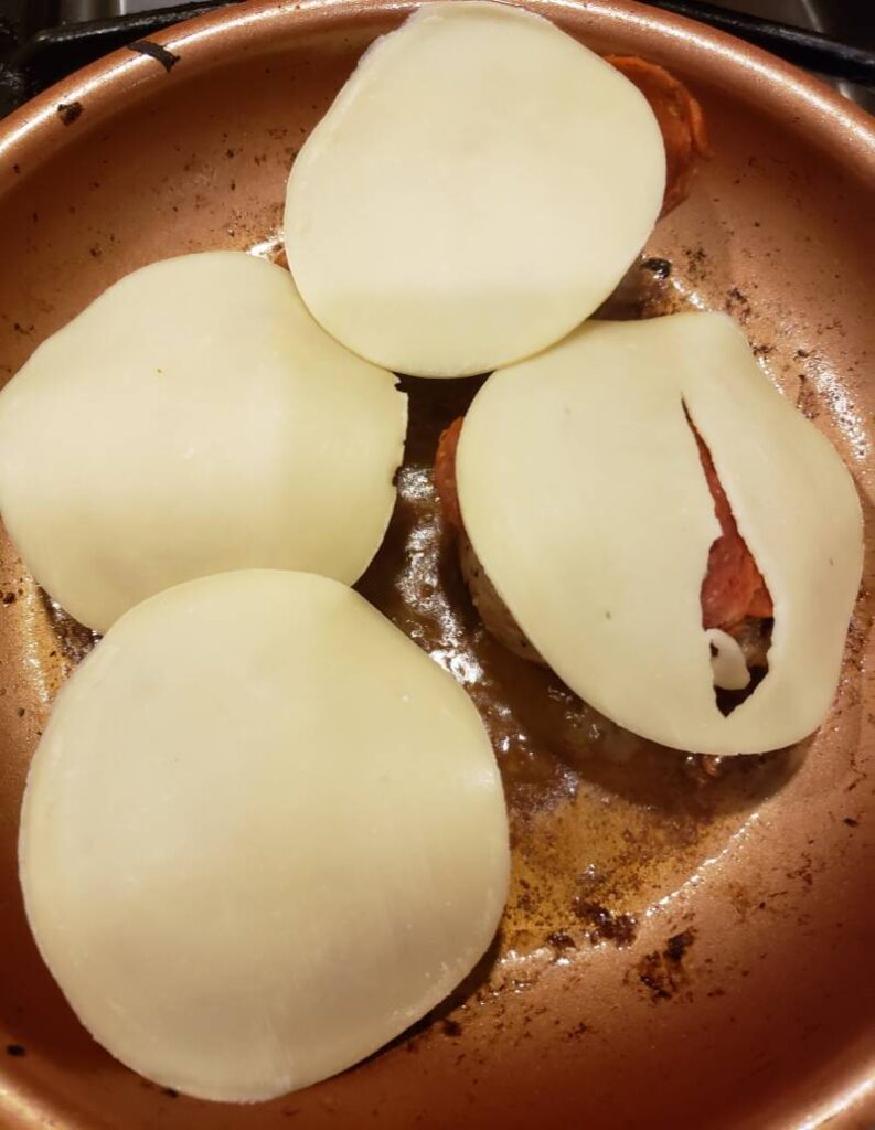- Place a slice of mozzarella cheese over the top of the burgers. Cover the pan and allow the cheese to melt.
